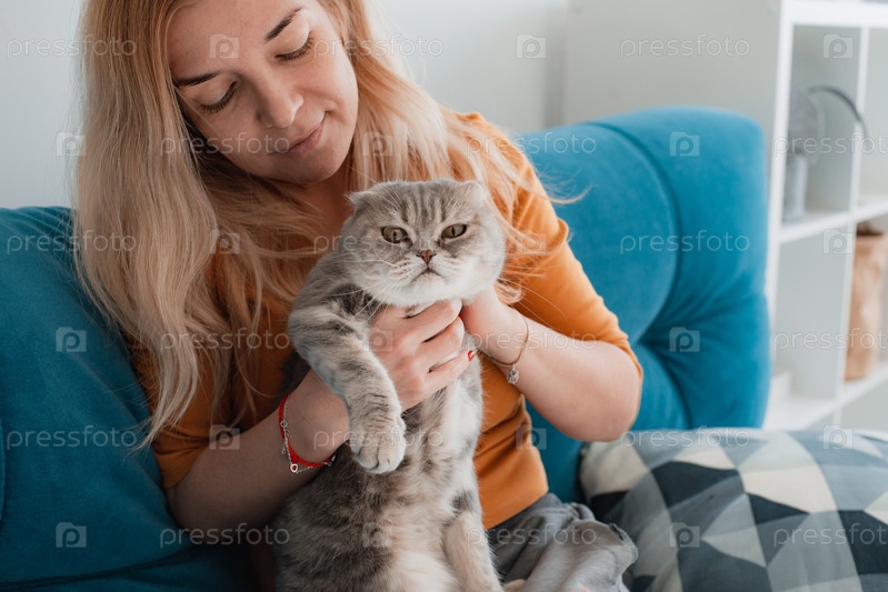 Портрет милой домашней чистокровной кошки, лежащей с хозяином дома. Неузнаваемая молодая женщина в желтой толстовке гладит чистокровную шотландскую вислоухую кошку у себя на коленях на голубом диване. крупный план