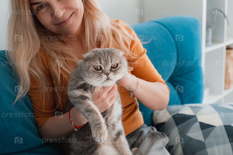 Портрет милой домашней чистокровной кошки, лежащей с хозяином дома