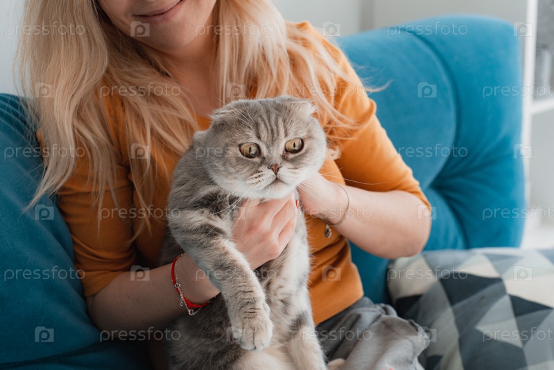 Портрет милой домашней чистокровной кошки, лежащей с хозяином дома. Неузнаваемая молодая женщина в желтой толстовке гладит чистокровную шотландскую вислоухую кошку у себя на коленях на голубом диване. крупный план