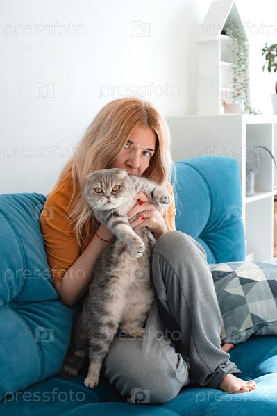 Портрет милой домашней чистокровной кошки, лежащей с хозяином дома. Неузнаваемая молодая женщина в желтой толстовке гладит чистокровную шотландскую вислоухую кошку у себя на коленях на голубом диване. крупный план
