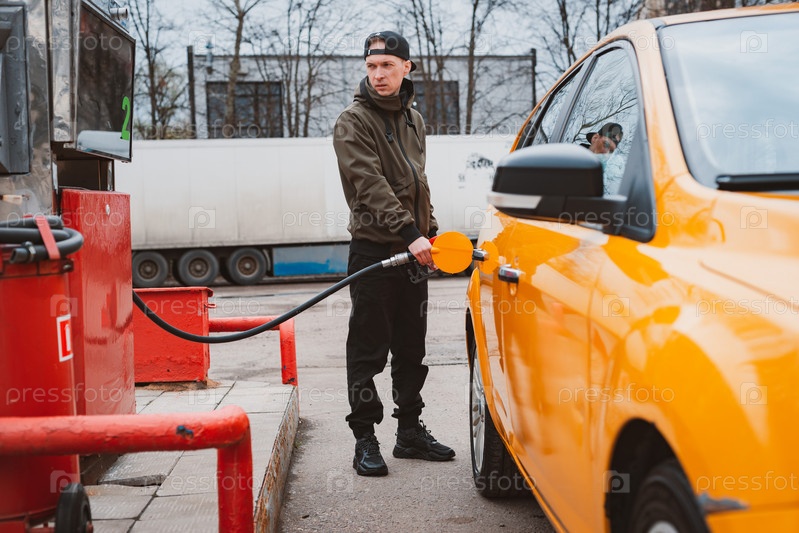 Неузнаваемый мужчина заправляет машину бензином на заправке. Концепция высоких цен на бензин, санкции, Россия