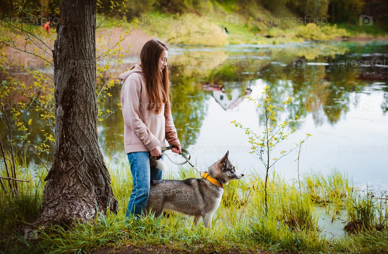 Выгульщик женского пола с домашним животным, гуляющим на природе у реки