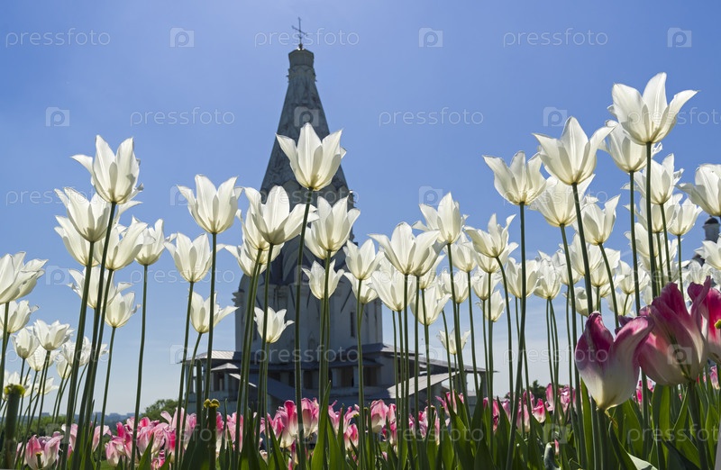 Цветущие белые тюльпаны на фоне церкви Вознесенья Господнего в Коломенском, Москва. Солнечный день в середине мая