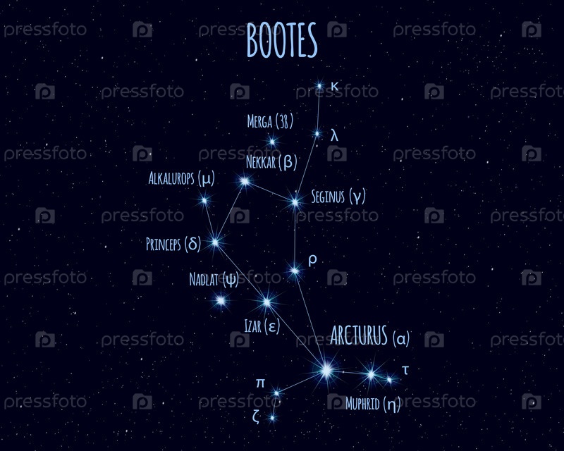 Созвездие Волопаса (Пастух), иллюстрация с названиями основных звезд на фоне звездного неба