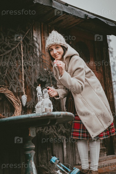 Праздничное украшение женщина создает атмосферу Рождества под открытым небом деревенский минималистичный современный из натуральных экологических материалов скандинавский стиль