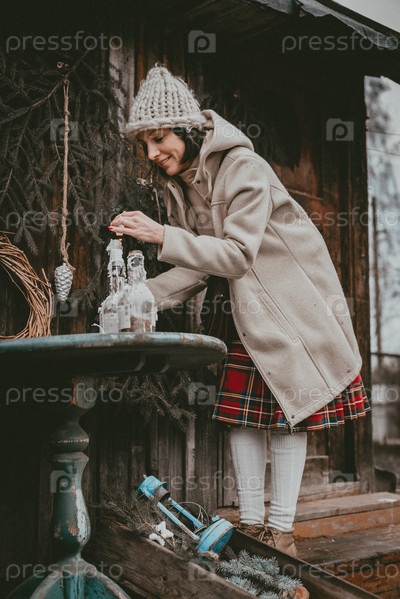 Праздничное украшение женщина создает атмосферу Рождества под открытым небом деревенский минималистичный современный из натуральных экологических материалов скандинавский стиль