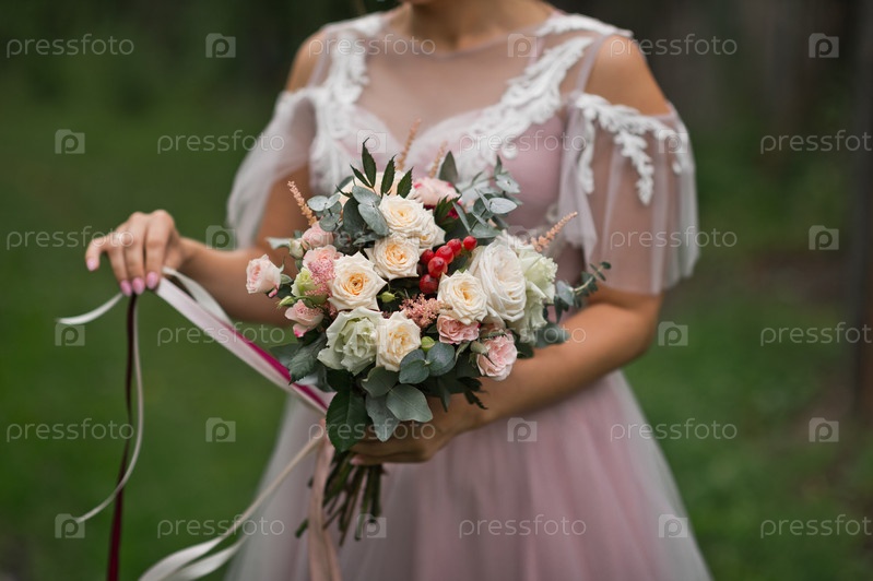 Растрепанный нежный свадебный букет в руках невесты из роз