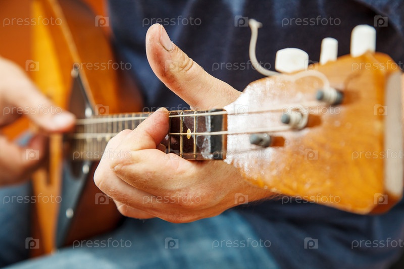 Мужчина играет на балалайке. руки крупным планом