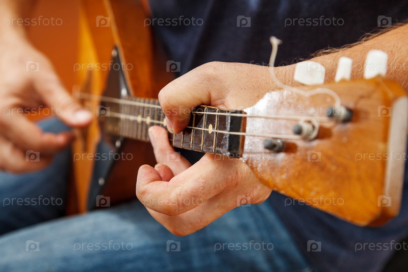 Мужчина играет на балалайке. руки крупным планом
