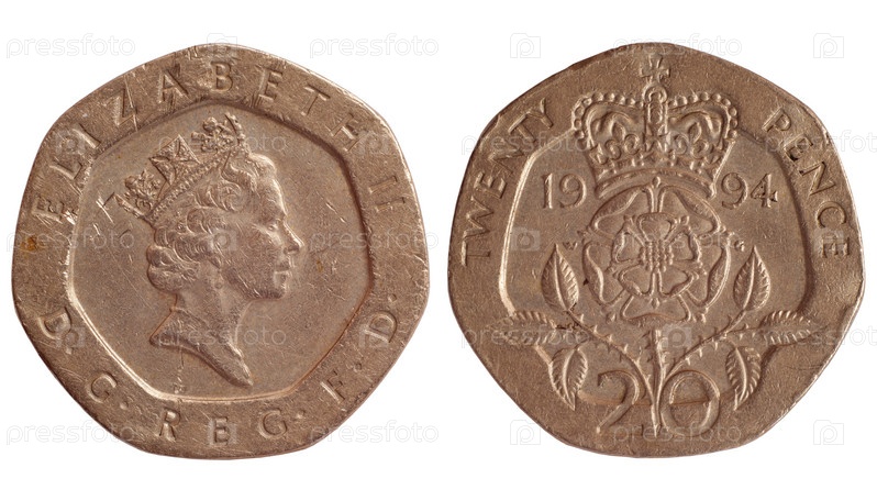 Монета великобритании, двадцать пенни 1994 года, изолированная на белом фоне