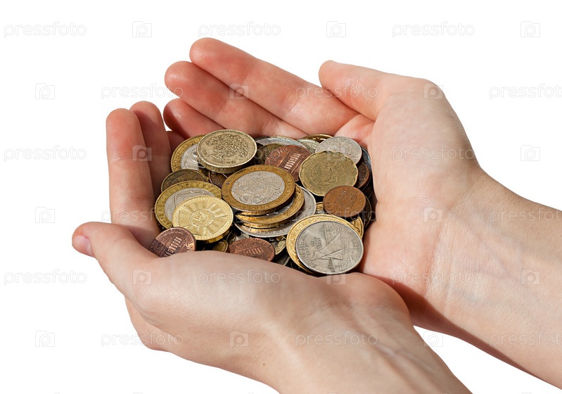 Женские руки держат кучу разных монет на белом фоне