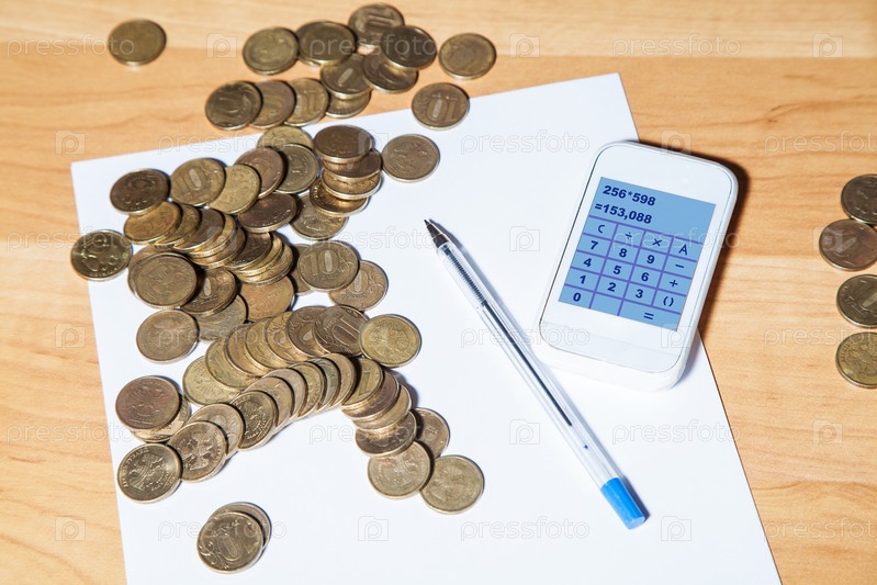 Монеты, ручка, бумага и калькулятор