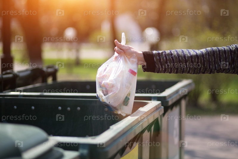 Рука с мешком пластикового мусора над контейнерами для разделения и сортировки в России со словами: стекло, пластик, бытовые отходы