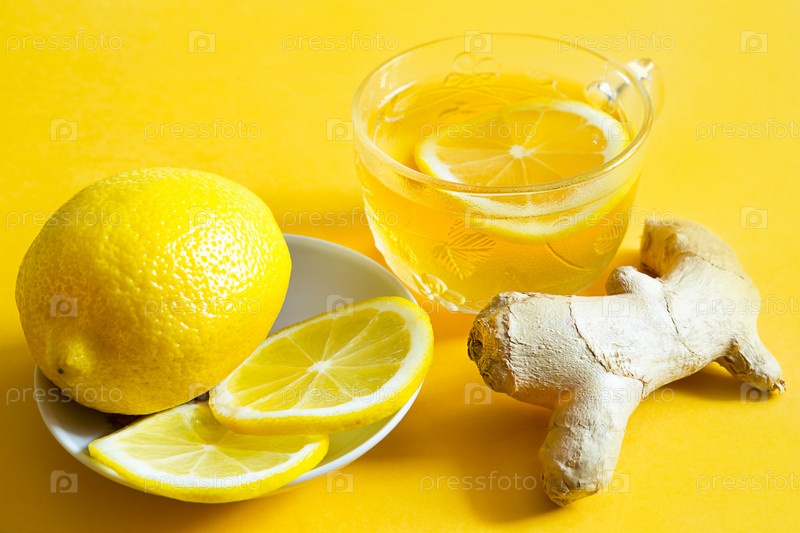 Лечебный чай в чашке, имбирь, лимон – укрепят иммунитет в холодное время года. Витаминный напиток для здоровья и ингредиенты на желтом светящемся фоне. Скопируйте пространство, ровно