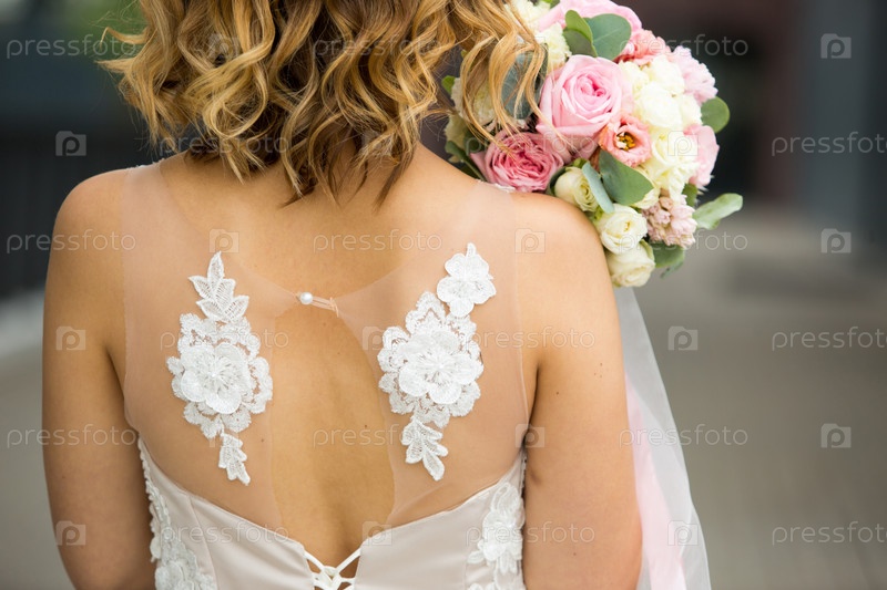 Задняя часть невесты в белом свадебном платье крупным планом. Букет невесты из роз в пастельных тонах, завитки. Крылья ангела в декоре платья. Сборы невесты, свадебная церемония. Место для текста