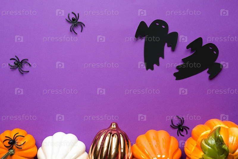 Хэллоуинские фоны из белых, оранжевых и золотых тыкв, пауков и черного призрака на фиолетовом фоне с паутиной и ужасными пейзажами. Ужас и страшный праздник с копией пространства