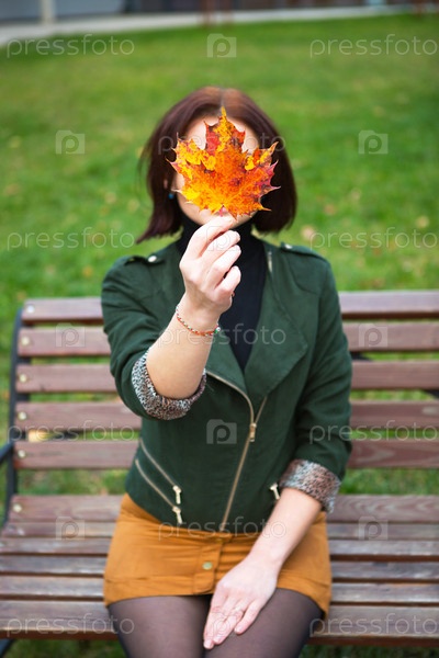 Женщина с желтым опавшим кленовым листом закрывает лицо. Осенний портрет без лица на скамейке в парке. Осеннее настроение