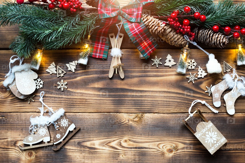 Рамка с рождественским декором зимних видов спорта на деревянном фоне. Новый год активный и экологичный, праздничное настроение, украшения: коньки, лыжи, санки, елка, шишки. Место для текста, плоская планировка