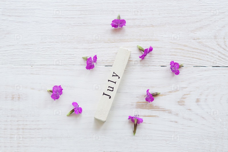 Вид сверху деревянного календаря с июльским знаком и розовыми цветами