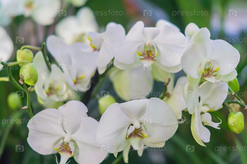 Цветущая ветвь белой моховой орхидеи. Экзотический цветок в тропиках
