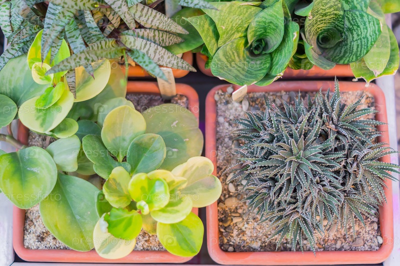 Различные сорта кактусов в цветочных горшках, природный фон, вид сверху