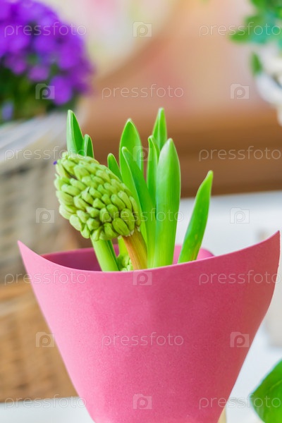 Крупный план цветка гиацинта с зелеными листьями в горшке. Весенний цветочный фон, мягкий фокус