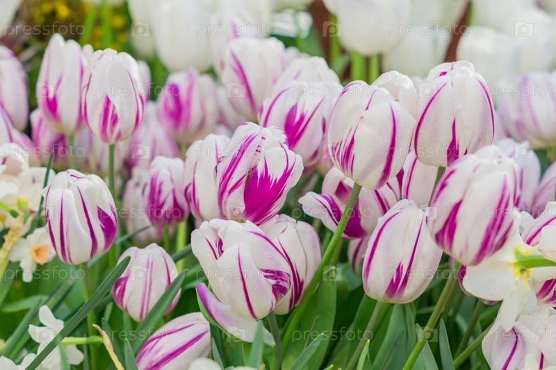 Крупный план свежих нежных цветущих розовых и белых тюльпанов