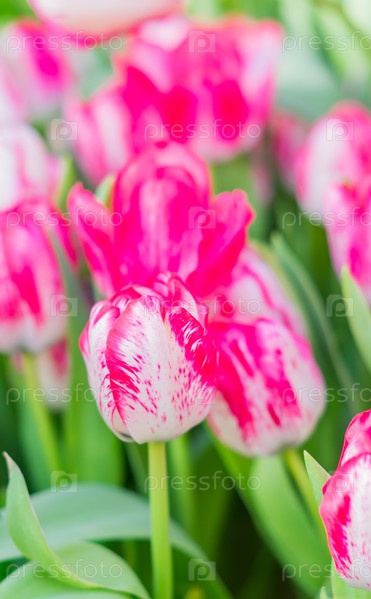 Поле цветущих весенних розовых и белых тюльпанов в саду