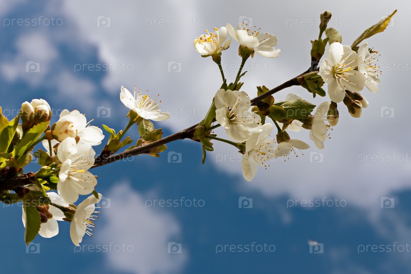 Вишни в цвету на солнечном фоне. Красивый весенний фон природы с веткой цветущей сакуры. крупным планом