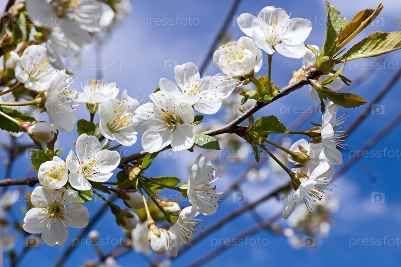 Вишни в цвету на солнечном фоне. Красивый весенний фон природы с веткой цветущей сакуры. крупным планом