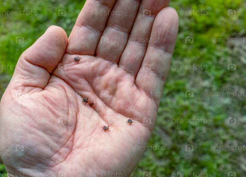 Клещ Ixodes ricinus на ладони человека.Иксод рицинус.Опасный паразит-носитель энцефалита, Лаймского боррелиоза, эрлихиоза. крупным планом