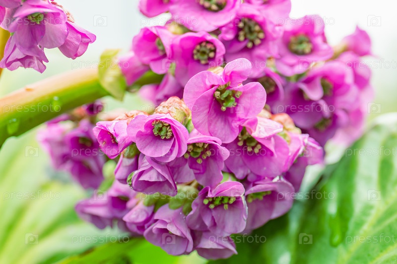 Цветущая бегония толстолистная, также известная как бадан сердцевидный, слоновьи уши, бадан, свиноподобный, сибирский или монгольский чай. Крупным планом