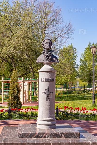 Памятник русскому поэту Александру ПушкинуГород Тула. Памятник великому русскому поэту Александру Пушкину. Россия май 2020. Надпись на памятнике "А.С. Пушкину"