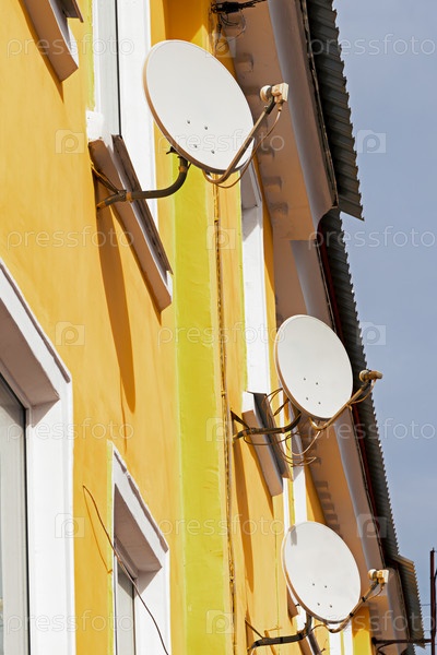 На фасаде здания установлено несколько спутниковых тарелок