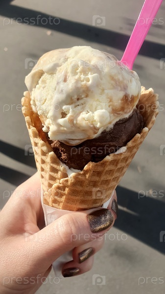 Шоколадное мороженое в вафле. Мороженое в руке крупным планом