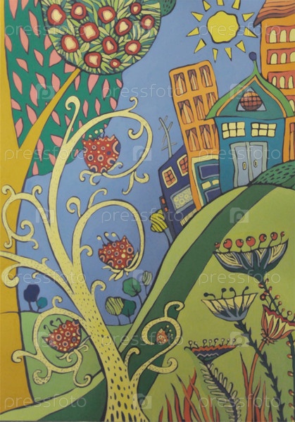 Фантастическая иллюстрация. Волшебный город. Сказочный мир. Пейзаж с растениями. Городской пейзаж с деревьями. Стилизованная картинка. Хищные цветы на картинке. Яркая красивая иллюстрация города. Иллюстрация к книге, нарисованная от руки