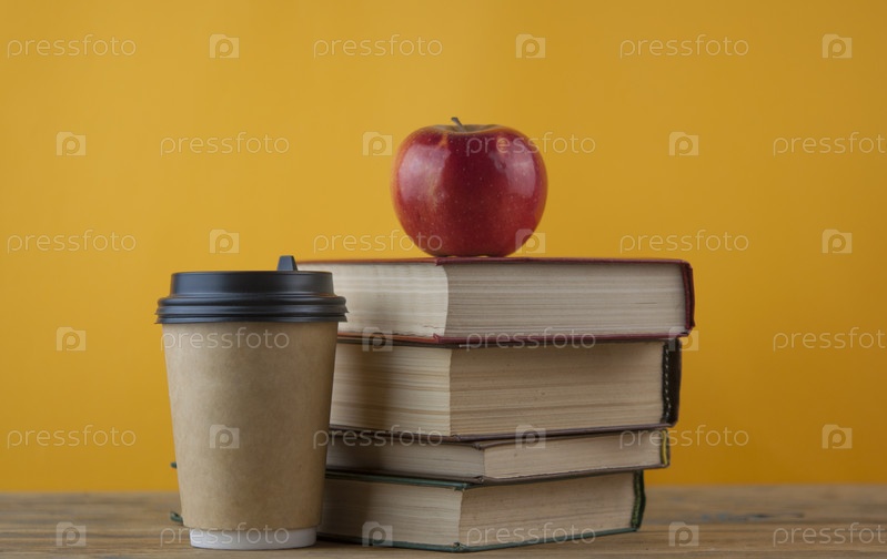 Яблоко на стопке книг на столе