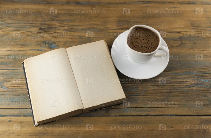 Откройте книгу с пустой страницей и чашку кофе на столе