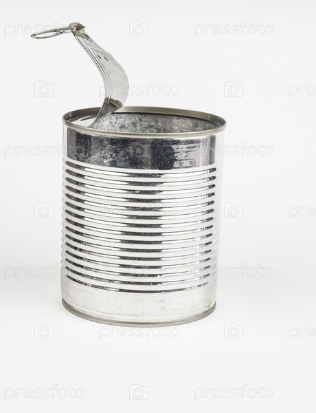 Пустая открытая алюминиевая банка на белом фоне