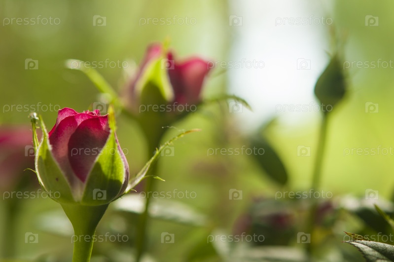 Цветущий бутон красной розы на сером фоне. Цветы в горшках. Небольшая глубина резкости