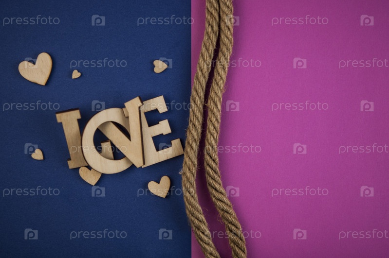 Любовное слово, маленькие сердца на фоне красочной бумаги. Вид сверху на День святого Валентина