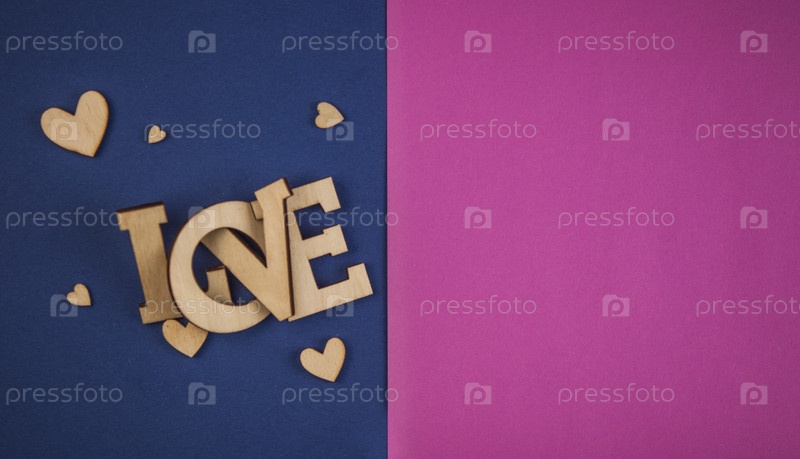 Любовное слово, маленькие сердца на фоне красочной бумаги. Вид сверху на День святого Валентина