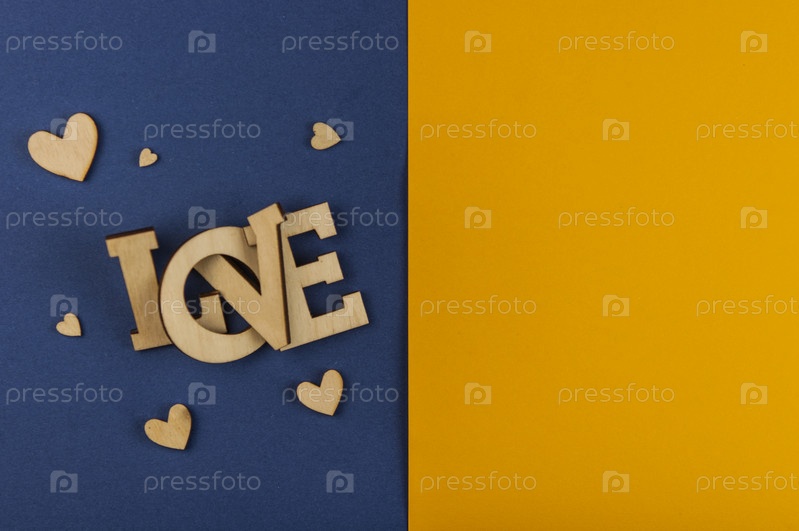 Любовное слово, маленькие сердца на фоне красочной бумаги. Вид сверху на День святого Валентина
