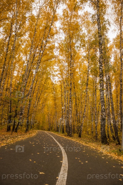 Асфальтовая дорога с красивыми деревьями по бокам осенью