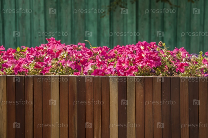 Красочные цветы петунии на улице города в деревянном горшке. Цветочное озеленение привносит буйство красок на улицы города