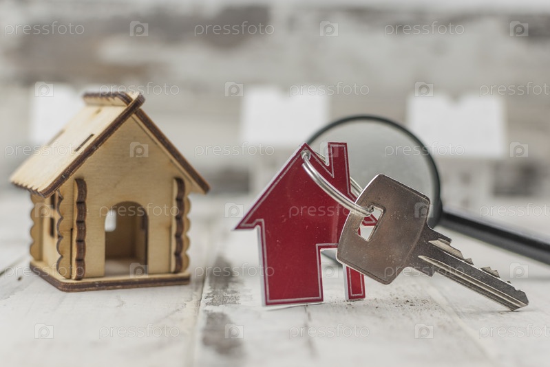 Металлический брелок в форме дома с металлическим ключом под увеличительным стеклом на фоне белой деревянной доски. Концепция недвижимости