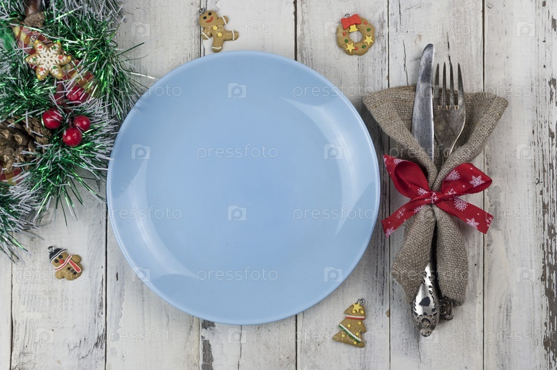 Праздничная композиция с пустой синей тарелкой и столовыми приборами на деревенском белом деревянном столе. Настройки стола. Вид сверху