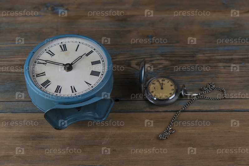 Будильник с римскими цифрами и винтажными карманными часами на деревянном столе