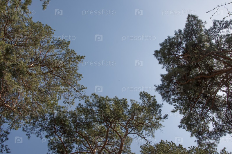 Небо с верхушками деревьев. Вид вверх с уровня земли. Голубое небо с солнцем и облаками