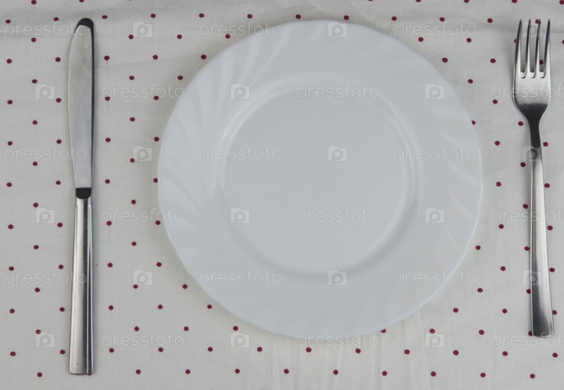 Белые пустые тарелки и столовые приборы на салфетке в горошек на белом деревянном столе. Настройка вида стола сверху
